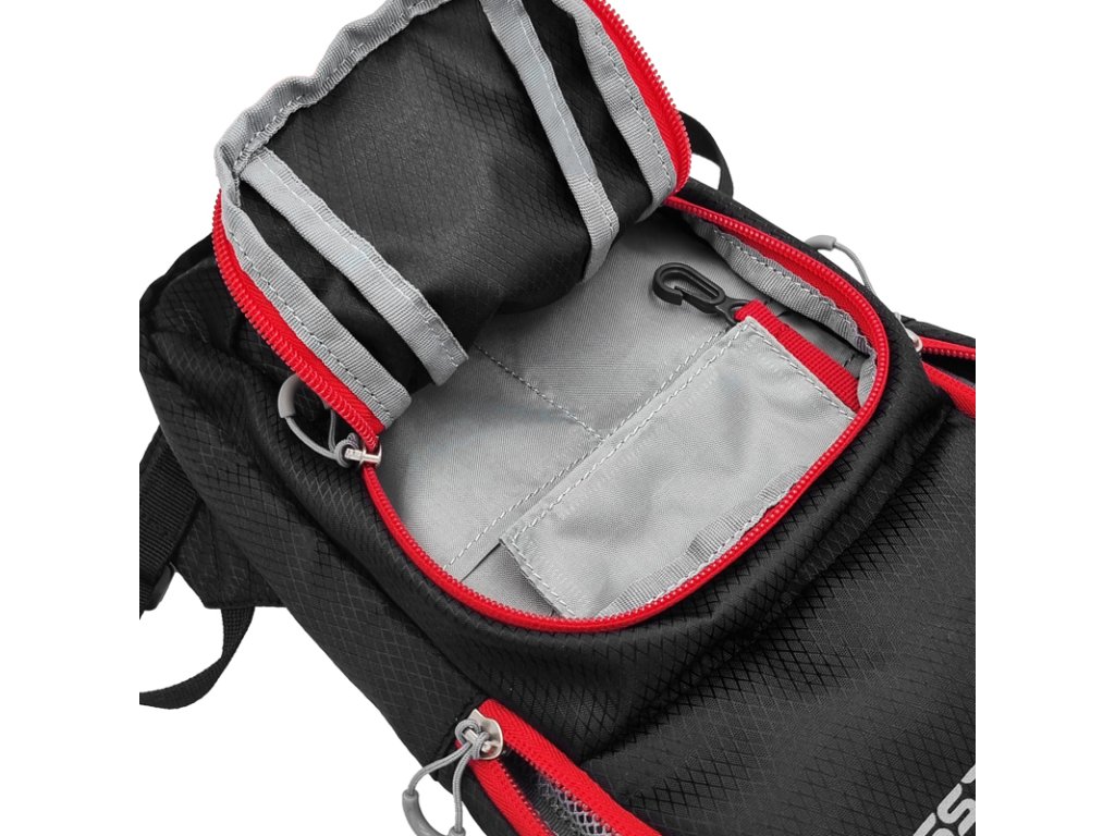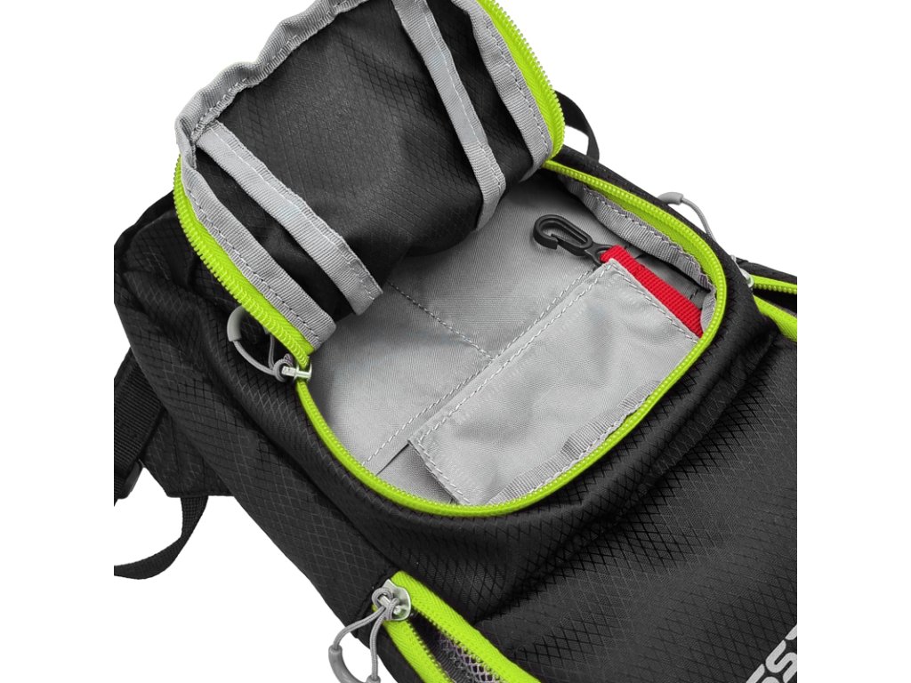 Malý cyklistický batoh BIKER je vhodný pro vodní rezervoár nebo drobnosti, které potřebujete při svých cyklovýletech s sebou. Batoh má pohodlný polstrovaný zádový systém, hlavní prostor s přihrádkou pro 2 litrový vodní rezervoár a přední kapsu na zip s organizérem na menší drobnosti a karabinkou na klíče. Batoh disponuje také odnímatelným bederním pásem. Pohodlné nastavitelné ramenní a hrudní popruhy a reflexní prvky jsou samozřejmostí.- kapsa na vodní rezervoár- přední kapsa na zip- voděodolná úprava bez SPF- nastavitelné ramenní popruhy- odnímatelný bederní pás- reflexní prvky materiál: 200D polyesterobjem: 5Lváha: 0,25kgrozměr: 23x42x5cmDoplňkové parametry