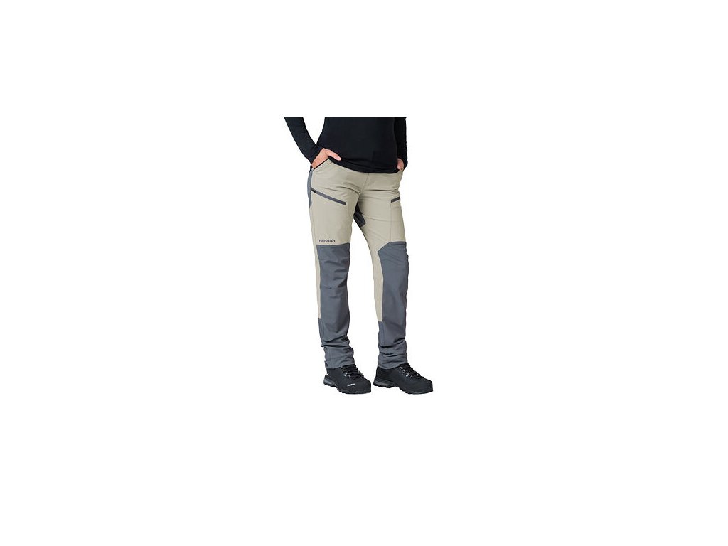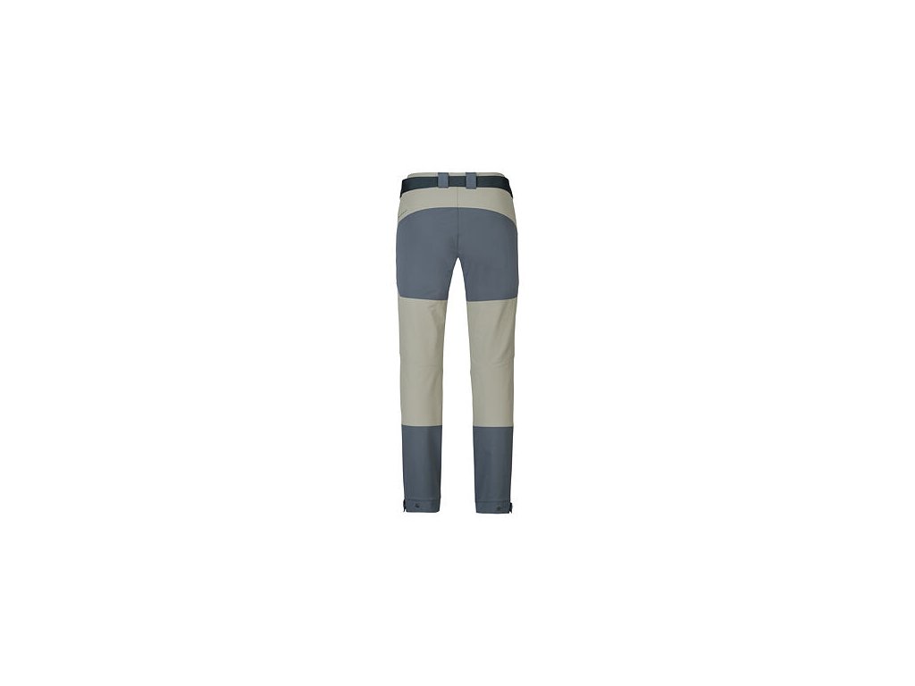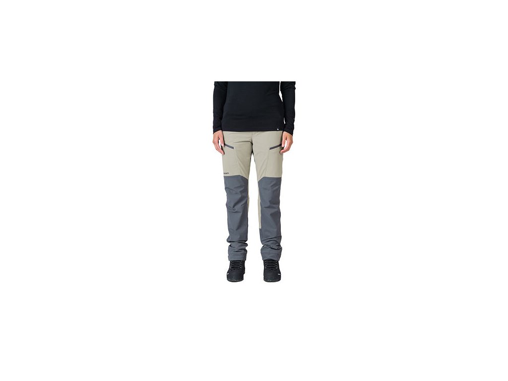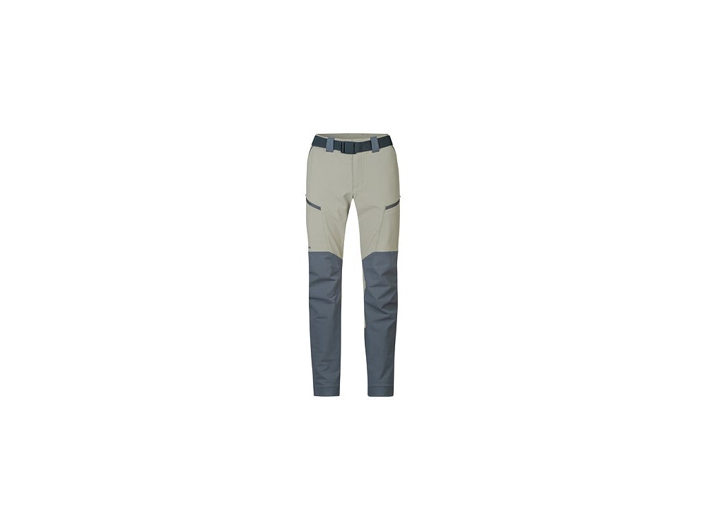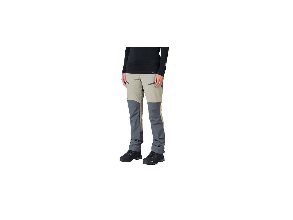 Technický střih kalhot s anatomicky tvarovanými koleny a regulovatelným obvodem pasu s páskem. Kalhoty mají v přední části dvě dostatečně hluboké a pohodlné kapsy a na stehnech dvě kapsy na zip. Spodní kraj nohavice s regulací šířky na patent se přizpůsobí různé botě a potřebám uživatelky.