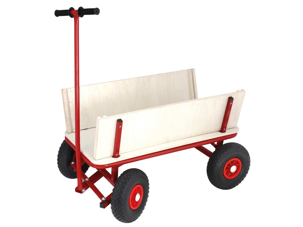 Konstrukce vozíku je vyrobena z pevné oceli v červené barvě, což mu dodává nejen robustnost, ale i atraktivní vzhled. Dřevěné stěny vozíku jsou odolné a snadno se dají rozmontovat, což zvyšuje flexibilitu při používání. Nafukovací kola a odolná ocelová konstrukce zajišťují, že vozík vydrží dlouho i při častém používání.