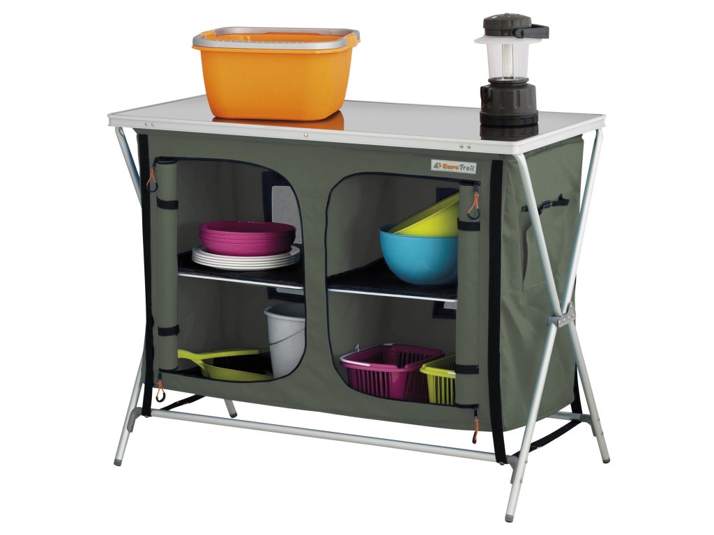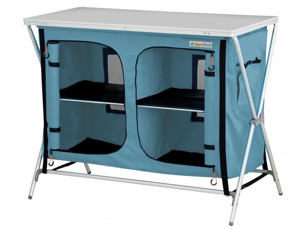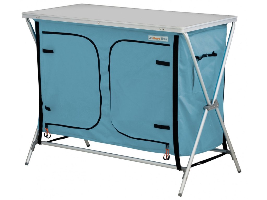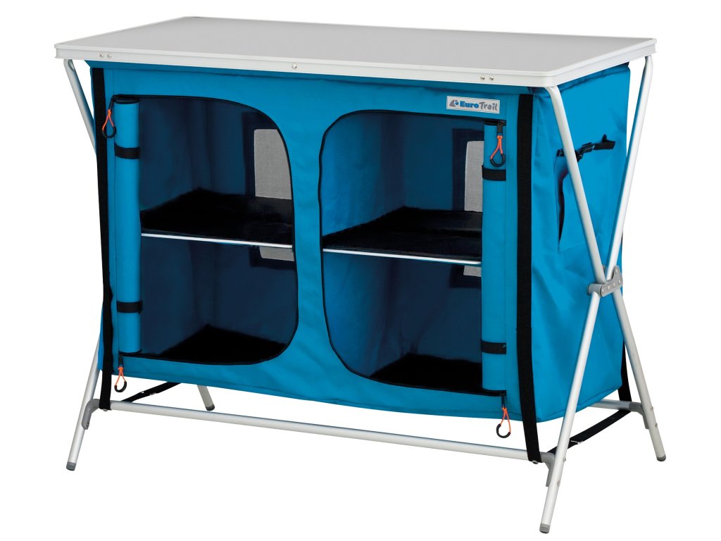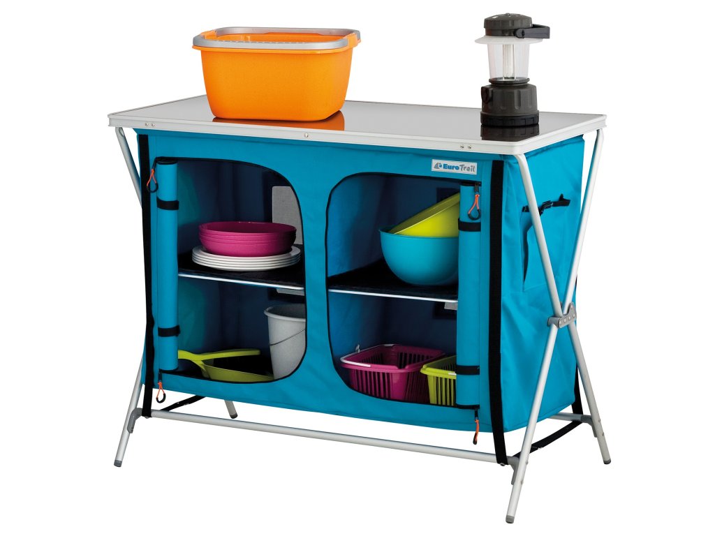 Díky své ideální pracovní výšce je skříňka Bonaire perfektní pro použití jako pracovní plocha pro přípravu jídel, stolek pro odložení nádobí nebo jako příruční skříňka na ukládání vašich kempingových potřeb. Její kompaktní rozměry (102 × 50 × 82 cm) poskytují dostatek prostoru pro všechny základní potřeby, ale nezabírá přitom příliš místa ve vašem stanu nebo karavanu.