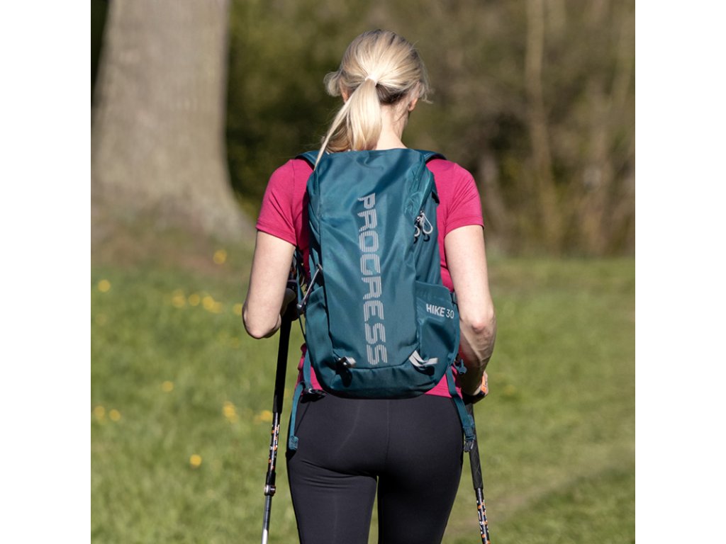 Turistický batoh HIKE 30 disponuje flexibilním zádovým systémem, který zajišťuje pohodlné nošení s dostatečným odvětráváním. Batoh má nastavitelé ramenní, hrudní a bederní popruhy. Mimo hlavní komoru má batoh ještě horní přihrádku se síťovanou kapsou na zip, přední skrytou kapsu na zip a karabinkou a dvě boční elastické kapsy na láhve nebo jiné vybavení. Batoh nepostrádá úchyty na trekové hole. Je kompatibilní s vodním rezervoárem. Samozřejmostí jsou reflexní prvky.