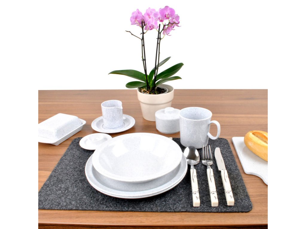 Hrnek v designu sady Waca Granit na první pohled zaujme svým nadčasovým a elegantním designem. Dále se může pochlubit kvalitním zpracováním a vysokou odolností. Nádobí je vyrobeno z vysoce kvalitního melaminu a díky protiskluzovým proužkům skvěle přilne k povrchu a manipulace s ním je tichá. Sada nádobí je odolná proti poškrábání a prakticky nerozbitná. Hrnek lze snadno mýt v myčce na nádobí.