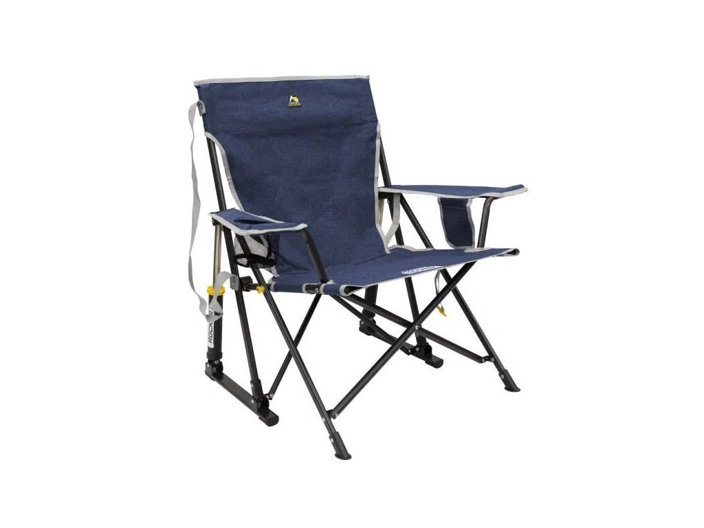 - Židle GCI Outdoor Kickback Rocker je vybavena držákem na nápoje a kapsou na telefon. Houpací křeslo má také systém zapínání na smyčky a kolíky včetně integrovaného popruhu pro snadné přenášení.
