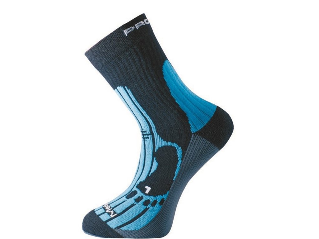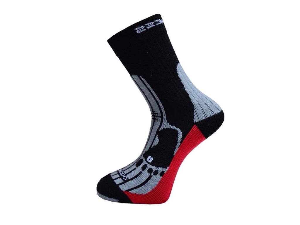 Turistické merino ponožky s obsahem špičkové vlněné směsové příze MULTITECH. Jde o ušlechtilou směs s vysokým podílem jemné merino vlny s funkčním polyamidem s posíleným antibakteriálním účinkem. Vlákno z ovčí vlny má samo o sobě antibakteriální účinky, v případě příze Multitech jsout tyto účinky ještě posíleny ionty stříbra, permanentně uloženými v polyamidových vláknech. Polyamid navíc posiluje oděruvzdornost a elasticitu příze. Merino vlna navíc zajišťuje výbotné termoregulační vlastnosti a hřeje, i když je vlhká.