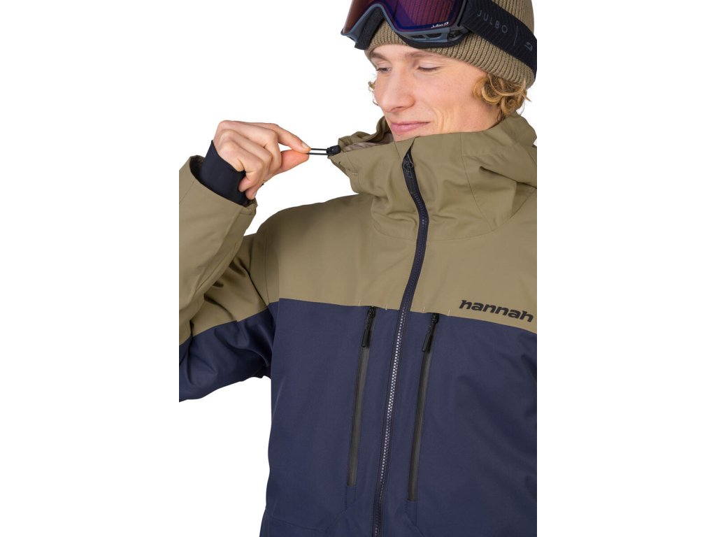 Od voděodolných YKK zipů na centrálním zipu a hrudních kapsách, dále odvětrání v podpaží, vnitřní systém kapes a sněhový límec v pase. Anatomicky tvarované rukávy s kapsou na zip na skipas jsou zakončené stahováním patkou se suchým zipem. Vnitřní elastické rukávové manžety s otvorem na palec snižují únik tepla a zároveň zajistí, aby sníh zůstal tam kde má. Systém propojení bundy a kalhot umožňuje snadné připnutí lyžařských kalhot Hannah Wiel.