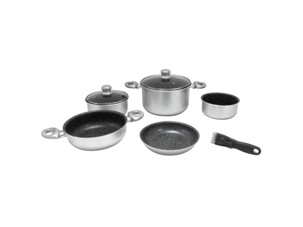 Vysoce kvalitní hliníková sada hrnců Gimex disponuje nepřilnavým povrchem. Všechny části jsou vyrobeny z odolného materiálu, který zajistí dlouhou životnost. Odnímatelné rukojeti jsou vybaveny bezpečnostním zámkem, který zamezí jejich neúmyslnému otevření. Sada je kompatibilní s indukčními vařiči, což zajišťuje širokou univerzálnost.