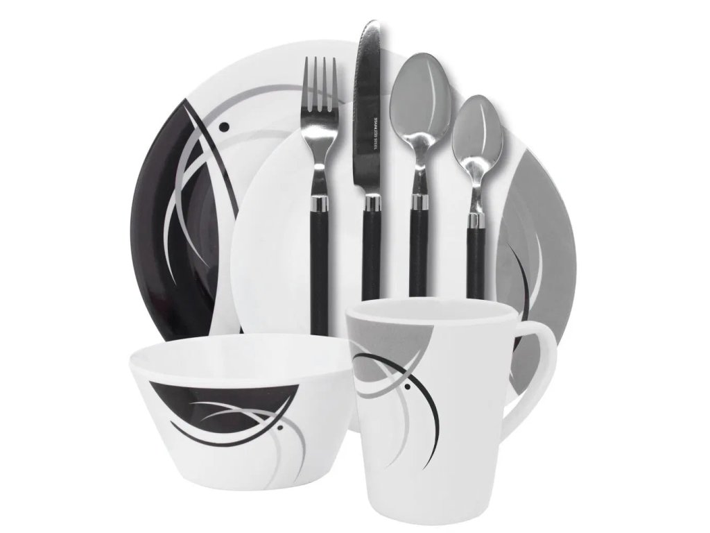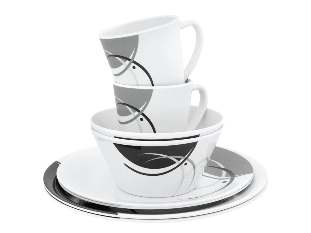 je skvělou volbou pro kempování nebo pobyt ve stanu. Sada je vyrobena z odolného melaminu, což ji činí lehkou a snadno přenosnou. Obsahuje vše, co potřebujete pro pohodlné stolování na cestách – talíře, dezertní talíře, cereální misky, hrnky a příbory. Tato sada není určena pro použití v mikrovlnné troubě.