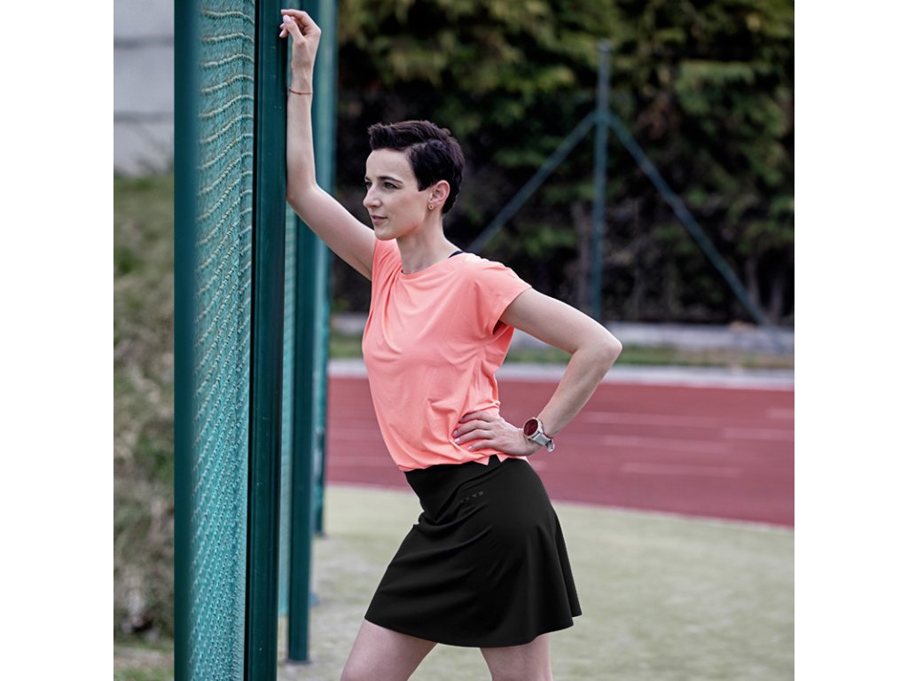 Dámskou sportovní sukni ZORA SKIRT si zamilujete na první pohled. Je vyrobené z na dotek úžasně příjemného, jemného a pružného materiálu, který zajišťuje maximální pohodlí a volnost pohybu. Sukně zaujme originálně řešeným pasem se zajímavým designovým prvkem v podobě embosovaného vzoru, který nejenže skvěle vypadá, ale je také mimořádně funkční. Zdvojený vyztužený laserem řezaný pas je dostatečně pevný a zároveň příjemně pružný, takže skvěle tvaruje oblast bříška. Spodní okraje jsou také laserem řezané a zakončené lepenými lemy. Sukně oceníte jak na běh, in-liny, tak třeba na vodu nebo výlet do přírody.